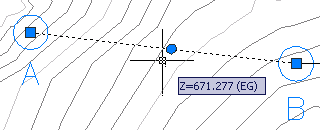 在要素线 AB 上,将显示一个小的圆形和一个显示了该点处桩号值和高程的工具提示。您可以使用光标将此点移动到新位置。