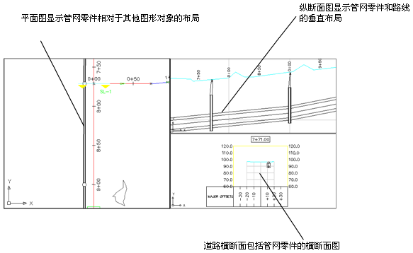 管网段的布局视图、纵断面图和横断面图。