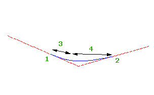 该图显示了在切线 1 和 2 之间曲线长度为 3 和 4 的不对称曲线。