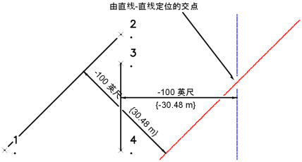 交点位于在点 1 和点 2 之间绘制且向右偏移 100 英尺的直线,与在点 3 和点 4 之间绘制、向左偏移 100 英尺的直线的相交处。