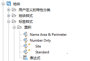 在“工具空间 ”的“设定”树中,“标签样式”集合包含一个或多个类型的标签样式,每种样式表现出使用该标签的对象在某一方面的独特性。下图显示了标签样式集、标签样式类型和各个标签样式的层次结构: