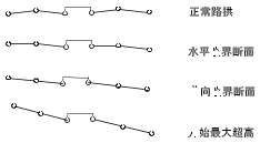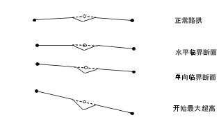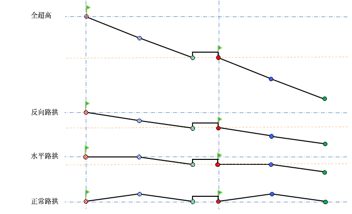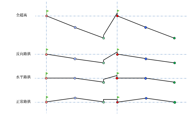 下图显示了将有中间带的公路作为一种道路类型并且两侧横断面造型均为双向横坡。在超高段,道路遇到反向同坡临界路拱。