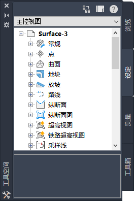 “工具空间”窗口最多可以显示四个选项卡:“浏览”、“设置”、“测量”和“工具箱”。如果该窗口中有多个活动视景,则“全景”窗口将显示相应的命名选项卡。