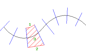 为计算组合体积,Autodesk Civil 3D 在采样线之间创建多边形,然后计算这些多边形的界内体积。通过将两个连续桩号之间的采样线偏移连接来创建多边形,如下图所示。