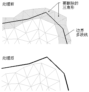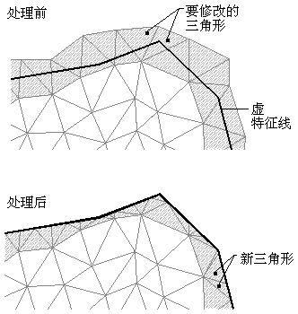 创建边界时,如果虚特征线与边界边缘重合,那么将在三角形边缘与边界的确切相交处剪裁三角形边缘: