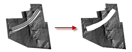 下图显示了一个示例,其中使用道路曲面作为原地面曲面的隐藏边界: