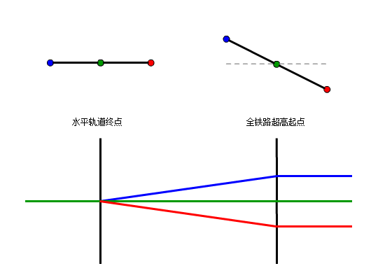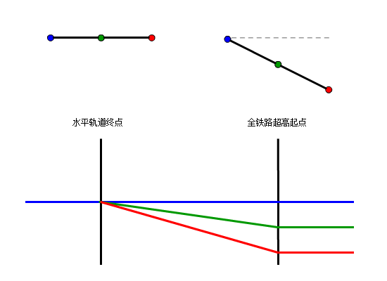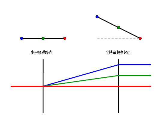 每个主题均包含显示横截面的插图,其中显示两条轨道和中心线在水平轨道终点和全铁路超高起点临界桩号中的情形。在横截面下方,纵断面显示两条轨道和中心线从水平轨道向全铁路超高的过渡:
