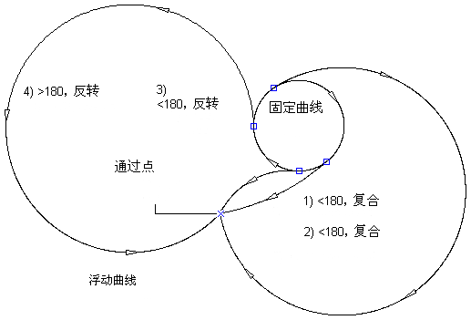 下图显示了附着到曲线的浮动复合曲线,以及给定半径和通过点的四种可能的解决方案。该图还显示了大于和小于 180 度的变量以及复合和反转变量: