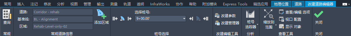 “改建道路编辑器”功能区选项卡