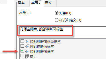 例如,若要使用特性集数据为横断面图中的要素线交叉添加标签,需要在设置特性集定义时,在“样式管理器”的“应用到”选项卡上选择“交叉横断面标签”和“要素线”: