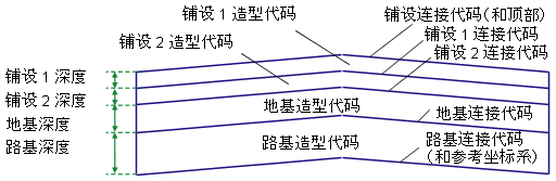 创建铺装横断面的部件将每个图层的深度或厚度作为用户定义的输入参数。创建铺装横断面的每个部件用于闭合图层区域以形成闭合的造型,即使这些图层实际上延伸到相邻的部件中。通过将相应的深度设定为零可以忽略图层。这将收拢该图层,因此造型的面积也为零。