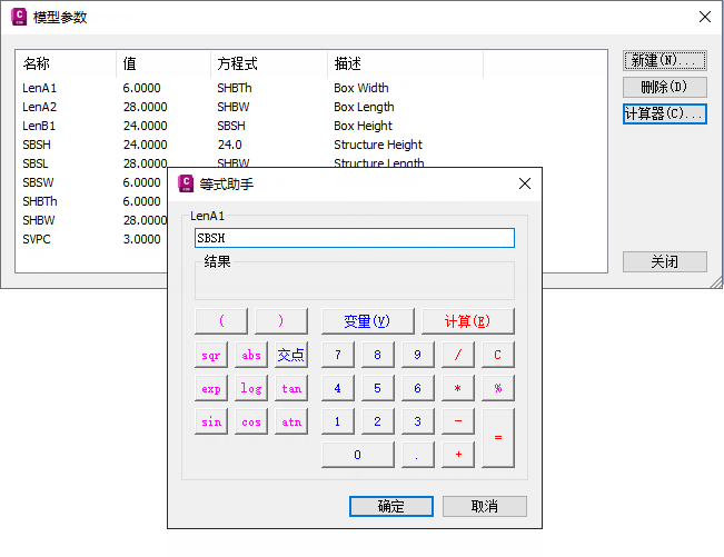 - 双击模型参数(例如 LenB1)的“方程式”列值,然后您可以输入值或方程式以指定零件的长度。