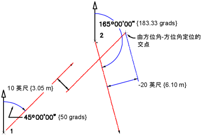 | 方位角 1,方位角 2 | 从现有点发出的直线的方位角(点 1 和点 2)。方位角为每一个矢量建立方向,并使用当前角度单位表示。 |