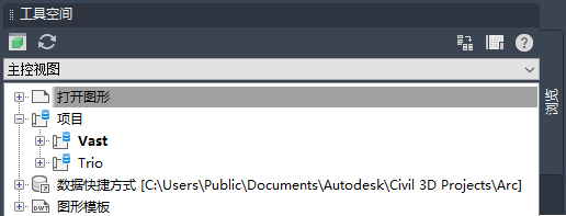 “浏览”树的“主控视图”包含四个与图形和项目相关的集合:“打开图形”、“项目”、“数据快捷方式”和“图形模板”。