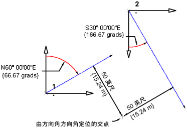 交点位于从点 1 绘制的方向角为 N66.6667"E 且向右偏移距离 50 英尺的直线,与从点 2 绘制的方向角为 S33.3333"E 且向右偏移距离 50 英尺的直线相交处。