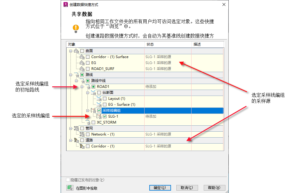 为采样线编组创建数据快捷方式时,“创建数据快捷方式”对话框的“状态”列中会显示注释,以通知您图形中的哪些项目是采样线编组的采样源。