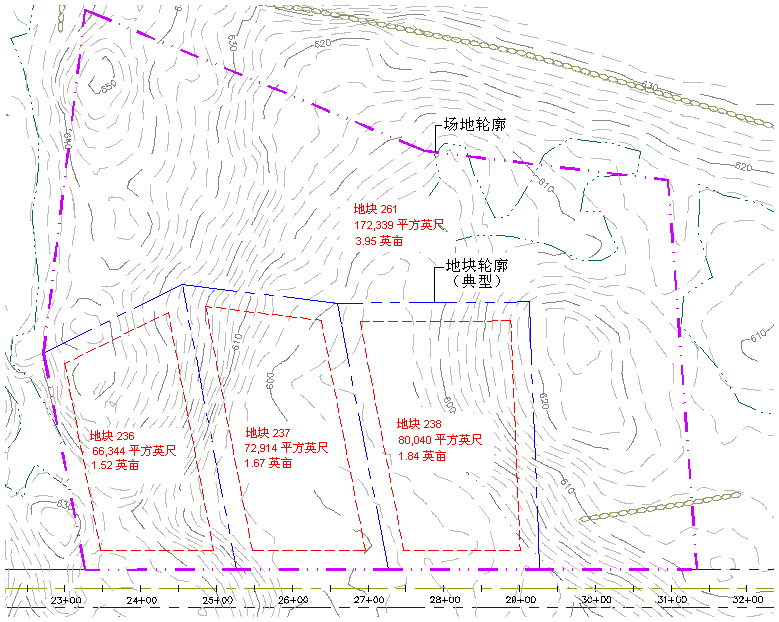 场地地块具有区域标签,可以隐藏或显示该区域标签。您可以控制场地地块边界的颜色和线型,还可以控制该地块边界相对于它所封闭的地块边界的绘制顺序。