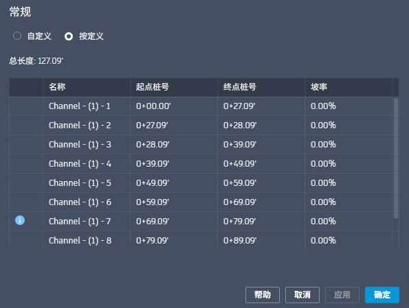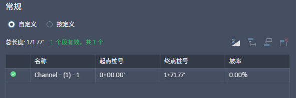 如定义。允许根据沿基准线的坡率变化自动创建渠道段。
