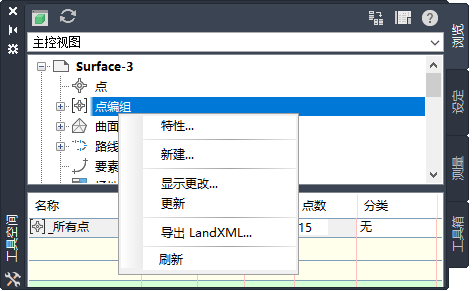“工具空间”窗口是用户界面中不可或缺的组成部分,用于访问命令、样式和数据。通过它可访问“浏览”、“设定”、“测量”和“工具箱”选项卡。右击这些选项卡上的各个集合或项目可以访问命令。