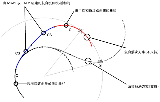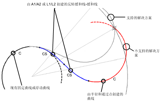 在需要两条紧接的反向过渡缓和曲线且曲线形状必须通过一个指定点的情况下,可以添加带有缓和曲线的浮动反向曲线。