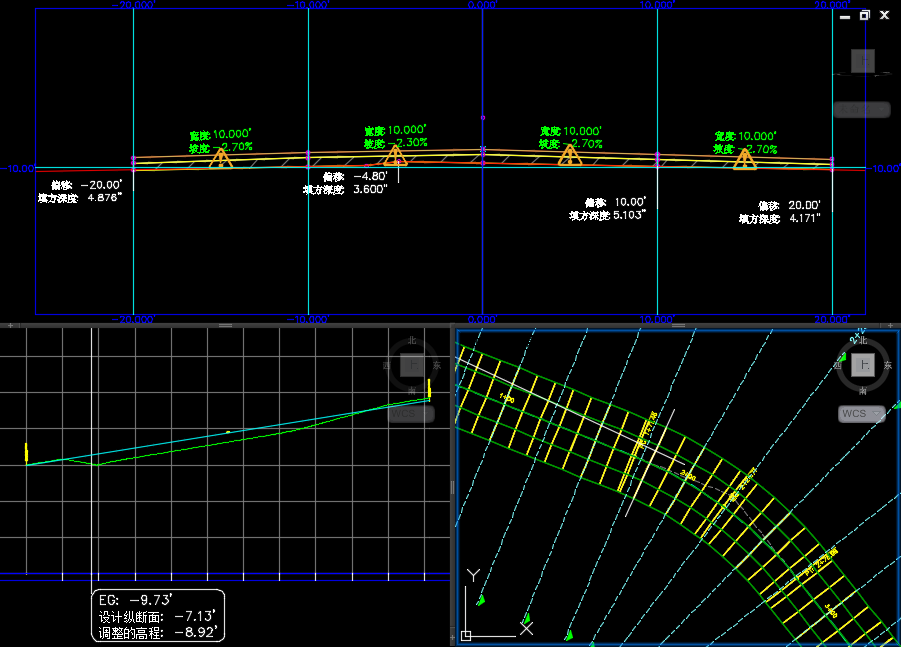 在改建道路内选择改建区域后,将会显示三个默认视口,允许您查看桩号的道路横断面(横断面图)、横断面的垂直纵断面(纵断面图)以及沿改建道路路线的道路横断面的位置(平面图)。