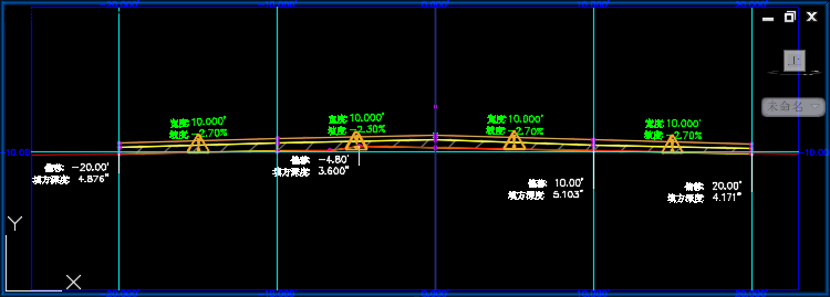 对于无中间带的改建道路横断面,“调整的高程”等于选定桩号的路拱点高程。