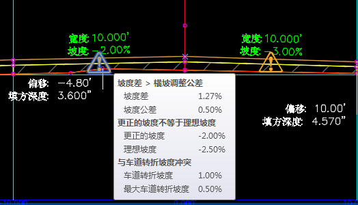 如果“更正的横向坡度”不等于“理想横向坡度”,则将会显示冲突。
