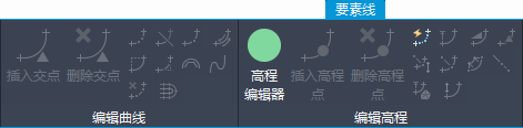 如果要素线已动态链接到道路,则功能区大多数要素线编辑命令不可用。下图显示了选定动态要素线时“要素线”关联功能区选项卡上的编辑面板。使用“高程编辑器”和“快速高程编辑”命令可以查看数据,但不能对其进行编辑。
