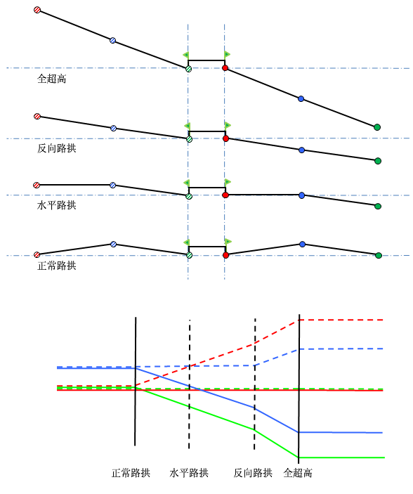 各种情况的典型超高视图。超高视图中的彩色虚线与横断面中的点对应。