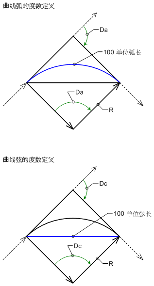 - 圆弧定义:指定曲度取决于圆弧。如果曲线是道路曲线,请使用此选项。对于道路曲线,曲线的度数为 100 单位圆弧所对的中心角度。