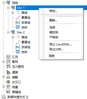 通过在“浏览”树中的命名场地集合节点(例如“场地 1”)上单击鼠标右键,可以访问这些特性。