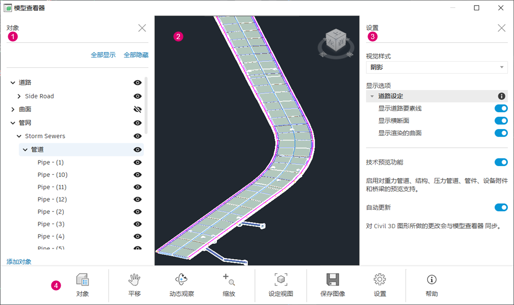 ,可以显示或隐藏该面板。有关详细信息,请参见 Civil 3D 模型查看器“对象”面板。
