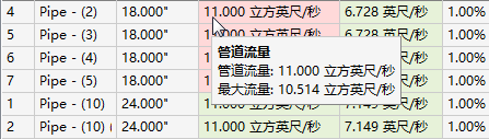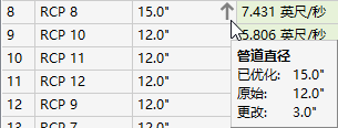 如果在“常规”页面上选择了“调整管道大小并重置管内底标高”分析类型并且已调整了管道直径,则该列将包含向上或向下箭头。将光标放置在该箭头上时,工具提示将会显示以说明调整管道大小的方式。