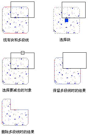 在不必重画其余任何组件的情况下,从划线中或从含有划线的块中减去选定部分。要减去的部分可以含有直线、多段线(闭合的或开放的)、圆弧、圆、文本或图案填充,或者由它们描绘。如果减去操作删除了部分闭合多段线,则多段线将重新生成闭合。如果减去操作将闭合多段线分为两部分,则这两部分均将重新生成单独的闭合多段线。但是,当减去操作将图案填充分为两部分时,图案填充将只剩下单个划线图元,可以单击任一部分来选择它。