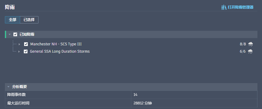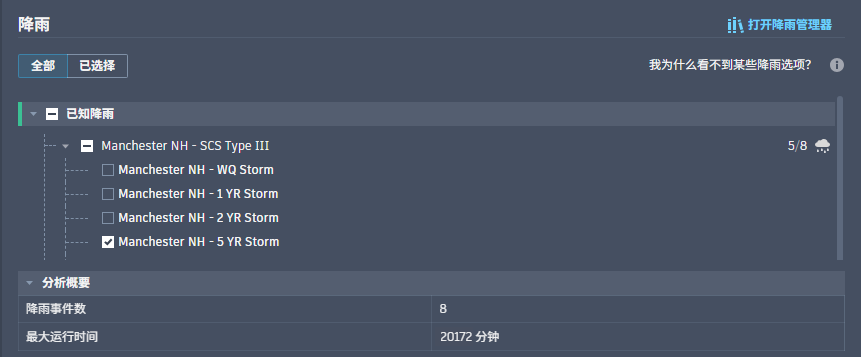 降雨集右侧的计数表示选择的事件总数和集中可选的事件数。底部的“分析摘要”显示应用于排水系统的降雨事件总数,以及指定的最大事件运行时间。