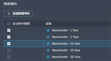 - 在“降雨列表”中,选择包含所需降雨事件的降雨集。