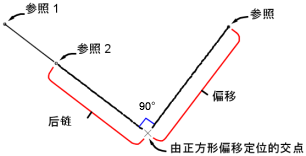 “正方形偏移”命令将列出到交点的后链距离和偏移距离。