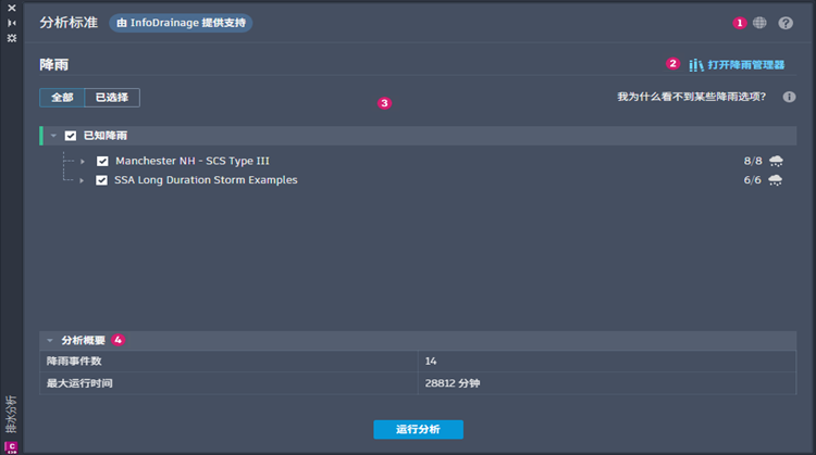 - 分析概要。显示应用于排水系统的降雨事件总数,以及指定的最大事件运行时间。