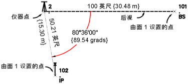 通过从面1 向右旋转水平角度 0,和距离具有描述 BS 的仪器点 30.480 处的垂直角度 100 来定位点 101。