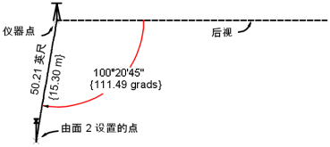 点 101 位于距离仪器设置 15.30,观测角度为从后视向右旋转 311.4954 处,实际旋转的物理角度为 111.49,垂直角度为 301.03,此点的描述为 IP。除非输入限定后缀,否则角度和距离将使用当前单位。