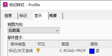 标记样式用于控制纵断面图中交叉对象的外观。标记样式的外观在“标记样式”对话框的“显示”选项卡上进行控制。从“视图方向”列表中选择“纵断面”,以查看和编辑为纵断面图配置标记样式的方式。有单个组件可控制标记(用于显示交叉纵断面、要素线、测量地物和三维多段线)和交叉竖线(用于显示交叉路线)的显示。