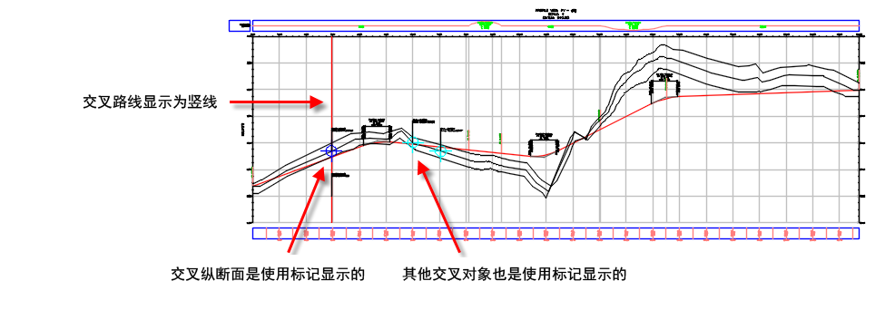 您可以向纵断面图添加交叉,以标识线性对象相对于初始路线穿过纵断面的位置。