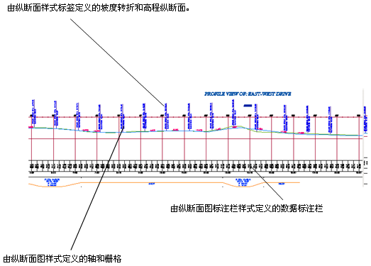 纵断面图可以包括一个或多个相关纵断面,以及沿 X 轴、在栅格之上或之下的多个数据标注栏。数据标注栏使用桩号标注、高程、水平简图和帮助进行工程分析的其他数据来注记纵断面。
