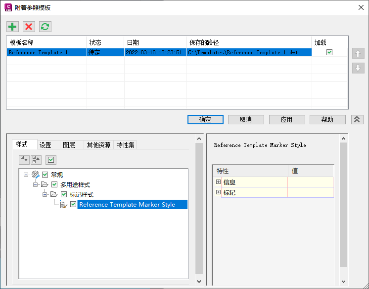 注: 如果清除“加载”复选框并单击“应用”或“确定”,系统将从图形中删除参照模板中未使用的组件,并且不会使用对参照模板进行的其他更改更新该图形。已使用的组件(如图层)将保留在图形中。