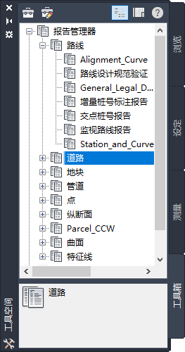 “工具空间”中的“工具箱”选项卡是运行报告和扩展程序的主要界面。与“测量”选项卡一样,您可以根据需要显示或隐藏“工具箱”选项卡。