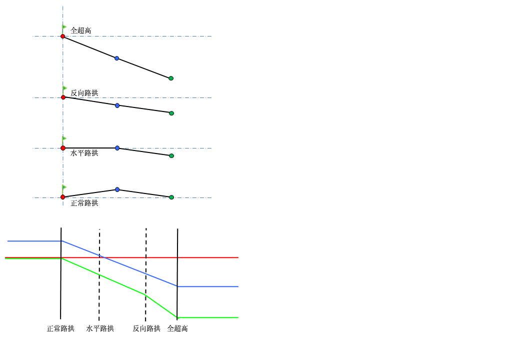 下图描述了无中间带的双向横坡道路的曲线内部轴方法。