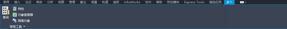如果同时选定多种类型的对象,则功能区中会显示“多个”上下文选项卡。例如,如果选择一个管网对象和一个路线对象,则会显示“多个”上下文选项卡。