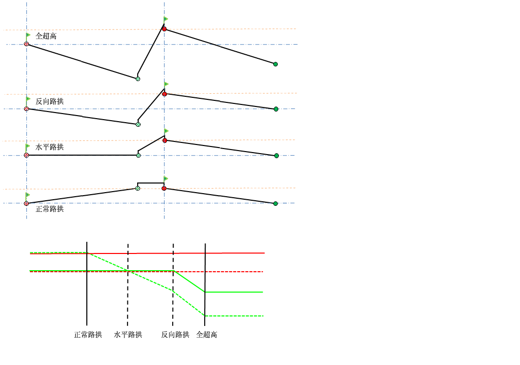 下图描述了有中间带的单向横坡道路的曲线外部轴方法。