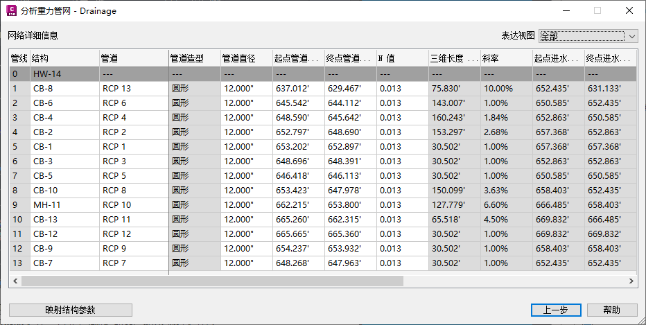 您可以单击“映射结构参数”按钮打开映射排水结构参数对话框。您可以使用“映射排水结构参数”对话框将零件生成器零件的参数映射到“分析重力管网”命令所需的参数。