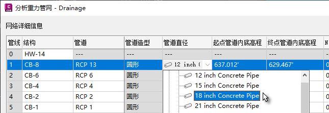 可以从下拉列表中选择管网零件列表中的可用管道尺寸。